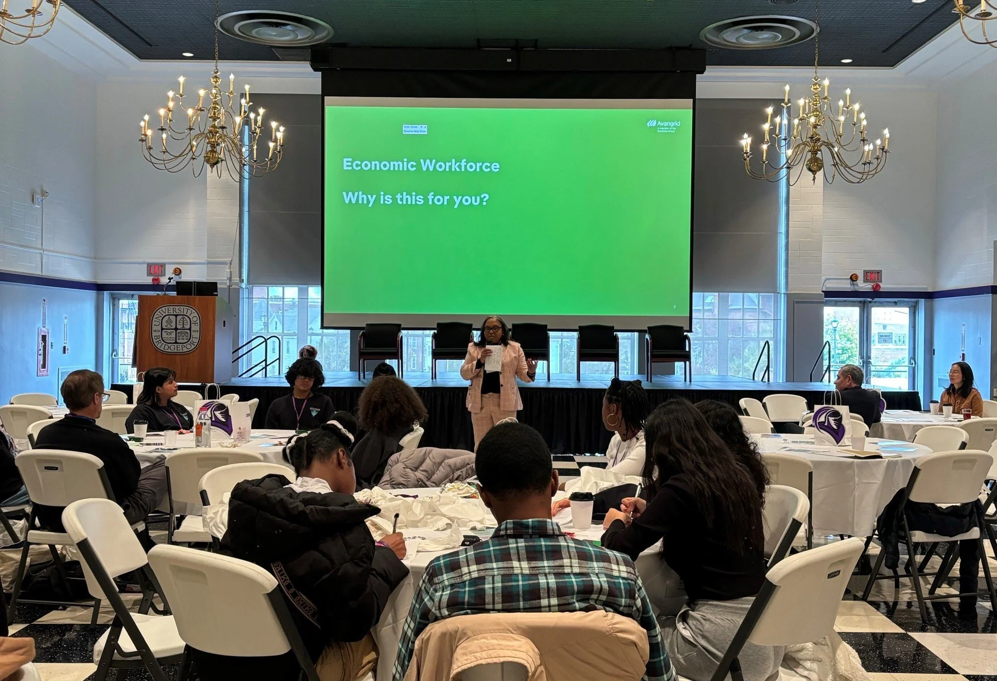 Orange, CT – Avangrid, Inc. (NYSE: AGR), a leading sustainable energy company and member of the Iberdrola Group, and the University of Bridgeport (UB) last week held the first Offshore Wind Workshop on campus to outline opportunities and career pathways for local high school and college students in the New England region’s emerging offshore wind industry. The workshop, which took place on November 9, 2023, hosted more than 80 local students from Fairchild Wheeler High School, Central High School, University of Bridgeport, and other local schools, and included panel discussions detailing the diversity of job opportunities within offshore wind, as well 1-on-1 engagement with students and current Avangrid employees.
